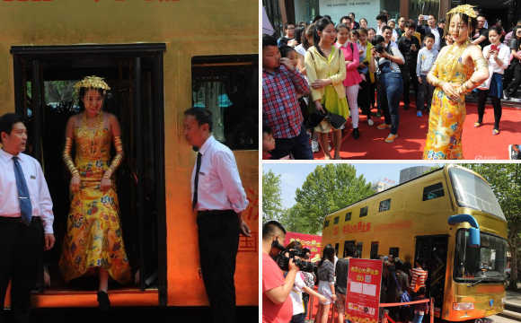 4月25日,一輛“黃金公交車”亮相山東濟(jì)南。據(jù)介紹,該公交車80%的部分都貼了金箔,“黃金美女”模特身上佩戴的黃金飾品價值兩百萬,公交車車內(nèi)掛滿了數(shù)千件黃金飾品,重達(dá)幾十公斤,總共價值500余萬。(來源:騰訊新聞 陳寧/CFP)