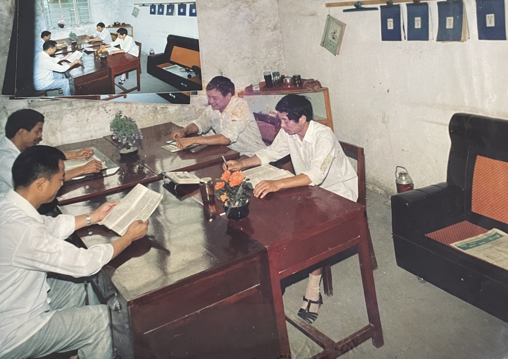 ▲80年代,機(jī)關(guān)辦公室工作場(chǎng)景。新舊都不一樣的四張桌子拼成一張大長(zhǎng)桌,大家面對(duì)面圍坐著辦公。桌面上的兩盆鮮花植物,算是為數(shù)不多的裝飾。