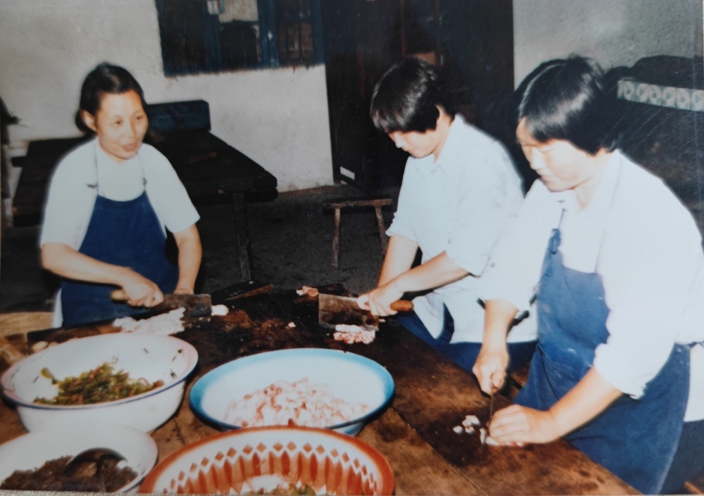 ▲80年代,職工食堂工作場(chǎng)景。每天清晨開(kāi)始切配食材。