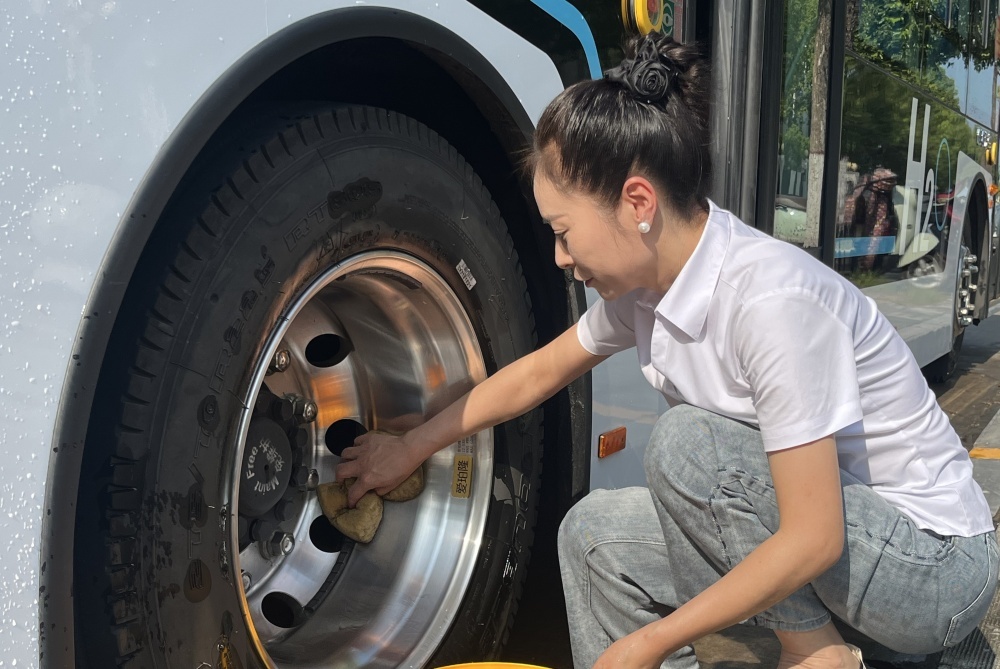 汗水濕透衣背,她細(xì)心擦拭著車輛的每一個(gè)角落,為乘客營造干凈舒適的乘車環(huán)境。