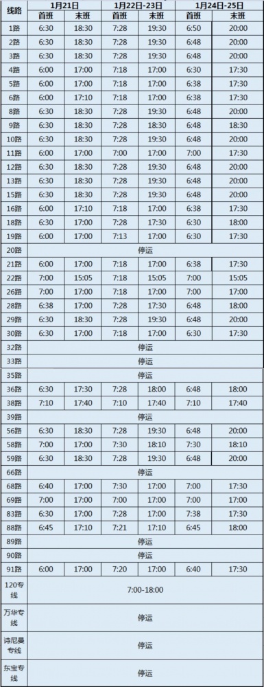 春節(jié)期間,市公交集團(tuán)公交線路營(yíng)運(yùn)計(jì)劃有調(diào)整。2023年1月21日-1月25日(除夕至初四)各營(yíng)運(yùn)線路相較平常在首末班次、發(fā)班間隔上有所變化,為方便廣大市民春節(jié)前后出行,現(xiàn)將春節(jié)期間公交營(yíng)運(yùn)安排通告如下: